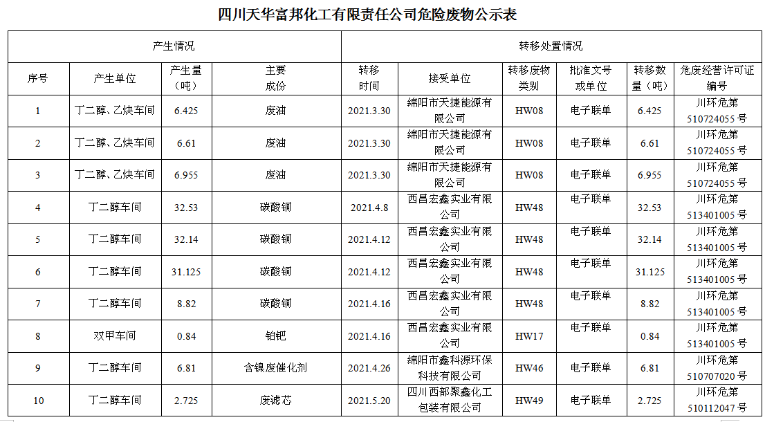 四川天華富邦化工有限責(zé)任公司危廢轉(zhuǎn)移情況公示