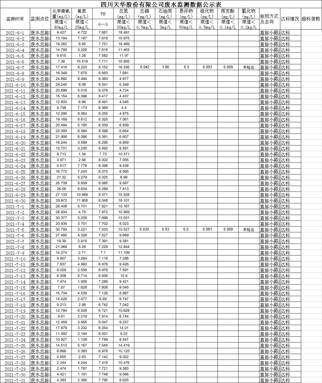 四川天華股份有限公司6月、7月廢水監測數據公示