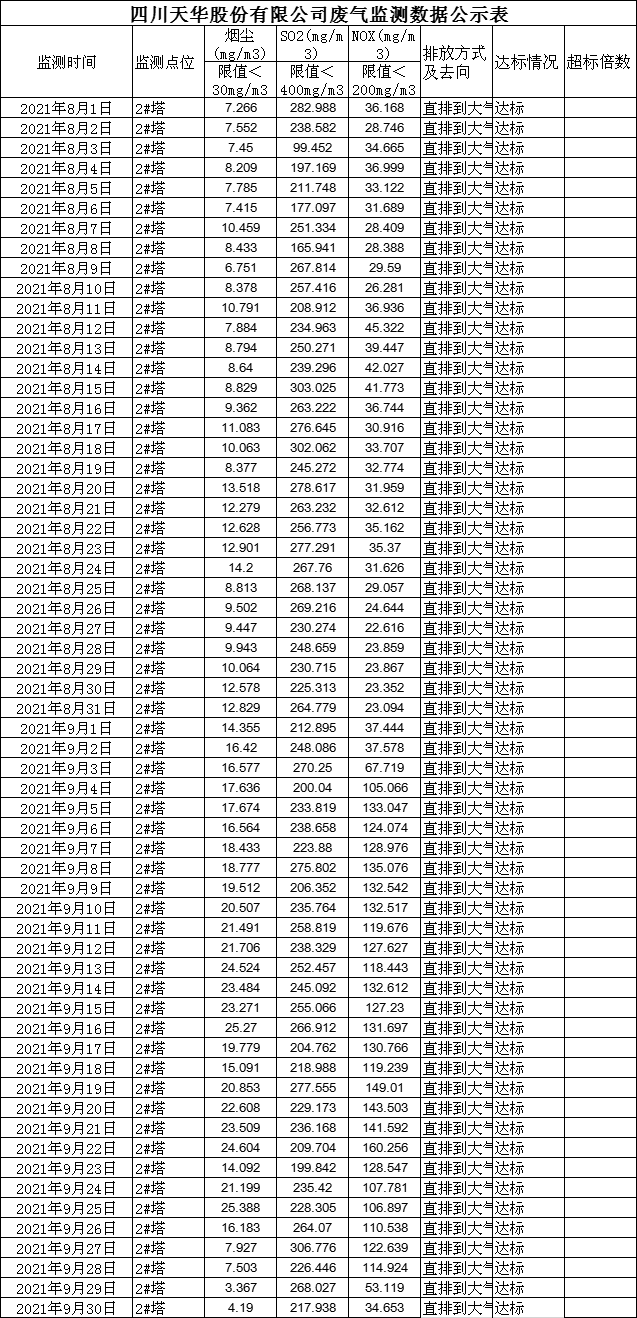 四川天華股份有限公司8月、9月廢氣監測公示