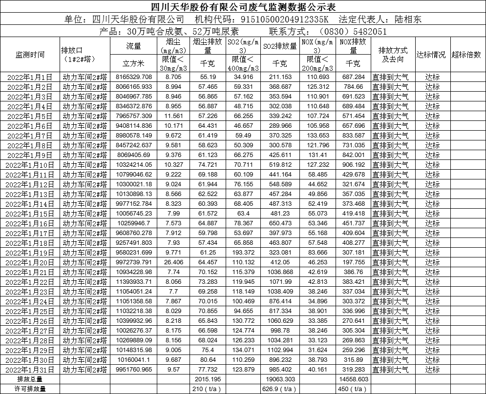 四川天華股份有限公司2022年1月廢氣監(jiān)測公示